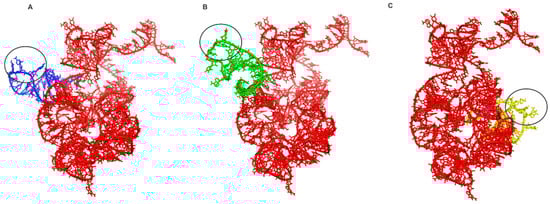 The docking experiments results. In red the ancestral PTC. In (A) the tRNAGly anticodon loop and PTC (eForce = −1929.96 KJ/mol), in (B) tRNAArg anticodon loop and PTC (eForce = −26017.11 KJ/mol) and in (C) tRNAAsp anticodon loop and PTC (eForce = −5100.29 KJ/mol). The black circle indicates the anticodon.