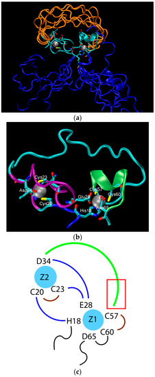 The structure of the ligase discovered through in vitro evolution [61]. (a) Superimposed NMR structures demonstrating the flexibility catalytic loop in orange, the rigid hydrophilic core in gray, and the flexible termini in blue; (b) The zinc-binding residues of the rigid hydrophilic core. Zinc atoms are grey balls. Residues coordinating them are marked; (c) Schematic of the zinc-binding residues. Strands that connect zinc atoms are in blue. The residues considered to be involved in coordinating zinc atoms are represented explicitly. The catalytic loop is in green. The red rectangle indicates the region presumed to contain catalytic residues.