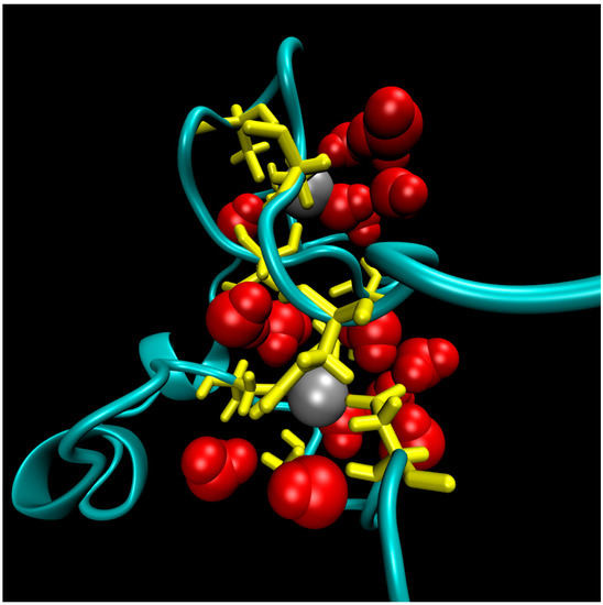 A representative snapshot of the hydrophilic core of the ligase from Molecular Dynamics simulations. The point of view is that of the flexible termini. Protein residues in the core are colored yellow, zinc ions atoms are grey balls, and water molecules within 5 Å of zinc ions are red.