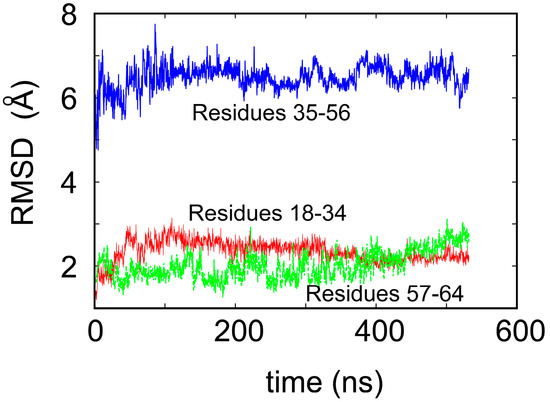 To shed some light on the origin of protein robustness with respect to mutations in its core, we carried out molecular dynamics computer simulations of the original ligase and its E28A mutant. The proteins were hydrated with 0.15 M NaCl to match experimental conditions, and production trajectories of 550 ns after equilibration were generated. To assess the flexibility of different parts of the protein, we calculated the root-mean-square deviation (RMSD) of the backbone atoms, which is a measure of how much the structure changes over time relative to the initial structure. We focused, in particular, on residues 18–34 and 57–65, which comprise the two Zn-binding regions, and residues 35–56, which form the loop (see Figure 1a). In accord with the NMR results, we observed that both Zn-binding regions retain their structure, as an RMSD of ~2 Å meant that the core structure remained stable over the course of the simulation (see Figure 3) and did not move away from its initial state to any significant degree. This is in contrast to a rather large RMSD, in the loop region, which indicates that this region undergoes significant structural fluctuations.