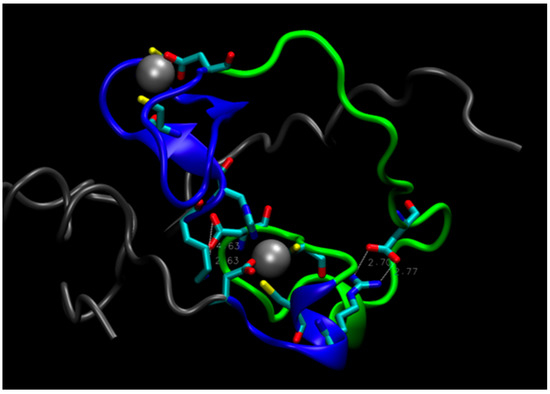 The structure of the double mutant E28A/D29A. Tails (residues 1–17 and 66–87) are gray, loop (residues 35 to 59) is green, residues 18–34 and 60–65 near Zn atoms are blue. White, dashed lines indicate salt bridges Asp55-Lys17 (on the left) and Asp43-Arg61 (on the right).