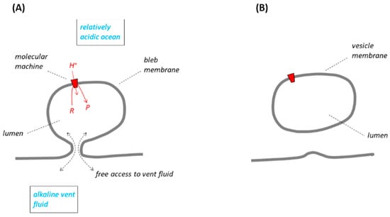 The “bleb” model of membranes escaping from the vents. The figure is of the last universal common ancestor (LUCA) (following the definition of []) with a lipid bleb membrane (see text) in grey, and according to the description of structures in [,,,]; the lipid has replaced earlier inorganic membranes. R and P are the reactants and products of a protein, natural pH gradient (ΔpH)-utilising molecular machine (red trapezoid). It is emphasised that the term “ΔpH-utilising molecular machine” is intended throughout the present work as broad description of any device, inorganic or protein, that uses the energy of a pH gradient, natural or otherwise, to drive useful chemistry by whatever mechanism. In part (A), the machine uses the proposed natural ΔpH between the alkali solution of the vent and the more acidic Hadean ocean to drive conversion of R to P. In part (B), the bleb has sealed off (or bubbled off) from its adjacent membrane and no longer has access to the natural ΔpH (see text).