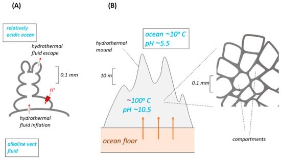Hydrothermal mounds of inorganic membranes. Inorganic membranes are shown in dark grey. (A) is from []. The red trapezoid represents a ΔpH-utilising inorganic molecular machine. (B) The main part shows the dimensions of the proposed hydrothermal mound and is from [,,]. The inset is of some of the billions [] of compartments within the mound, from [,]. We assume the value printed across the mound is intended to represent the internal pH of the compartments, being fed by the alkaline vent fluids (bold orange arrows). At the same time, the interstitial spaces between compartments are thought to have been fed by percolating water from the relatively acidic ocean. A resulting large ΔpH across the inorganic membranes of each compartment would have driven molecular machines in those membranes (but see text). The caption for Figure 2 in [] suggests that the thickness of the inorganic membranes was approximately 10 nm, but this is much less than that observed in laboratory-synthesised inorganic membranes [,]. Because ΔpH-utilising molecular machines may be located in membranes that are shared by two adjacent compartments (ostensibly a point not considered in [,]), their orientation and their direction of operation (forward/reverse) are difficult to define in this model (see Figure 2 in [] and the accompanying comments); they are therefore not shown here.
