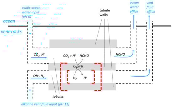 A third and more recently devised system for the natural pH gradient hypothesis describes how “juxtaposed hydrothermal fluids and ocean waters percolate through a labyrinthine network of interconnected micropores/microcompartments bounded by inorganic membranes” [,,,,,]. To avoid confusion in the terminology, the “interconnected micropores/microcompartments” [,,,,,] are called “tubules” in the following paragraphs and in Figure 3 which is otherwise based on the diagram (Figure 3) from []. The diagram includes a representation of a hypothetical, inorganic ΔpH-driven molecular machine catalysing the reduction of CO2 to formate and formaldehyde in the inorganic barrier between adjacent tubules. The term molecular machine is used in a broad sense (see Figure 1), and is not intended to misrepresent the CO2-reducing device described in [] (compare [] and [,]). By the definition in Figure 1, and contra [], there has to be a ΔpH-driven molecular machine within a functioning framework of the natural pH gradient hypothesis—otherwise no useful chemical work can be performed.