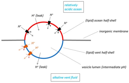 To escape from the vents, it was proposed [,,] that the LUCA membrane “bubbled off” or “sealed off” from its associated vent membrane to allow the organism its independence. Figure 1 illustrates the principle. The LUCA would have become vesicular, entirely bounded by a single membrane and surrounded by ocean water. During the sealing-off process, the lumen of the LUCA membrane system would have been completely disconnected from the supply of alkaline vent fluid, necessary to maintain the natural ΔpH. The ΔpH-dependent molecular machines in the membrane would therefore have continued only briefly to operate with the residual, trapped alkaline solution originating from the vent. The pH gradient across the vesicular membrane would soon have been either consumed by the molecular machines or dissipated by proton and/or hydroxide ion leakage. Had ΔpH not been restored, this would have quickly resulted in failure of the molecular machines, and death of the organism. A way to avoid this catastrophe, considered [,], was that the LUCA membrane acquired a protein proton pump in the period before the sealing-off process began. This proton pump would have had an energy source, perhaps a set of inorganic redox reactions, and catalysed proton translocation from the bleb lumen (at that time still contiguous with the vent) into the ocean. After sealing off, it would have continued this activity but then, of course, pumping protons from the vesicle lumen into the ocean, the resulting pumped ΔpH now supplanting the former natural ΔpH and driving the molecular machines in a chemiosmotic circuit similar to that in modern organisms. At this point the LUCA would thus have been able to function independently of any natural ΔpH as it escaped from the vents.