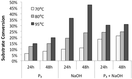 18] on activated amino acids. In addition, we observed that the highest rates of substrate conversion into longer oligomers under mild temperatures (70 °C and 80 °C) were achieved from alkalized solutions of trimetaphosphate. When the reaction was carried out at elevated temperatures of 95 °C, the highest conversion of substrate (close to 50%) was observed in the mixtures of alkalized diglycine.