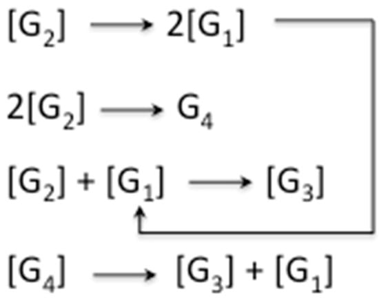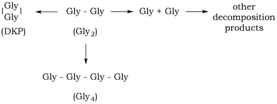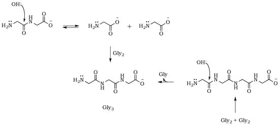 25]. In this way, any odd-numbered species could be a product of at least two different pathways when condensation and hydrolysis proceed as two parallel events. For example, triglycine could be a product of either a diglycine condensation with glycine, or the hydrolysis of any of the higher oligomers, such as tetraglycine (