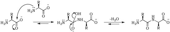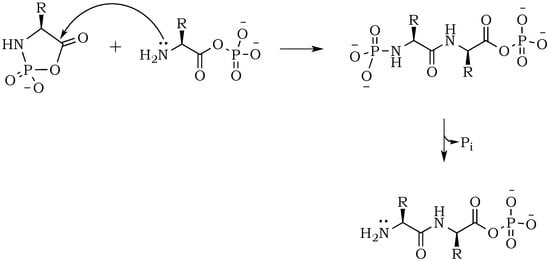 24]. Here, the nucleophilic attack of a free amine group from one amino acid or peptide on the phosphate-activated carboxyl carbon yields a new peptide product.