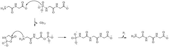 Figure 2A). However, the conversion of diglycine was slightly lower when compared with alkaline reactions mixtures, which might be attributed to the higher level of zwitterion form and its associated lower nucleophilicity of the amino group. Moreover, under neutral pH, the carbonyl group activation might be able to proceed only through a potentially rate-limiting intermolecular reaction of the migrating phosphate from