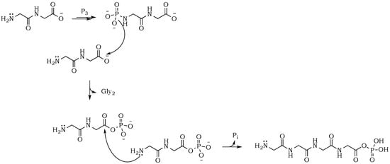 The propensity of polymerization reactions to be favored at high pH can be explained by electrostatic interactions influencing the ionic character of the reacting molecules. Moreover, an activating character of phosphate is clearly visible if we compare diglycine conversion to higher oligomers in alkalized solutions in the presence vs. absence of trimetaphosphate (
