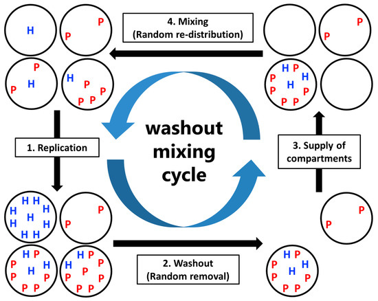Schematic of the compartmentalized host–parasite replicator (CHPR) system under washout–mixing cycles. H and P represent the host and the parasite, respectively.