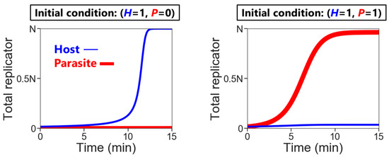 - Replication: The hosts replicate by themselves, while the parasites replicate depending on the hosts. The replication reactions occur for a fixed period of time in each compartment, according to the differential equations,andwhere H and P are the numbers of the hosts and the parasites in each compartment, respectively, and N is the amount of nutrients. Here, we assumed the second-order reactions based on the idea that replication occurs via the host (e.g., a replicase ribozyme) binding to a template (i.e., the host itself or the parasite). Reaction constants kH and kP used here were determined, based on the realistic values obtained from our previous RNA replication experiments [30]. We assumed here that the parasite replicates much faster than the host (i.e., kP is much larger than kH). Therefore, the hosts replicate better when the compartment does not contain any parasites (Figure 2, left), while in the presence of the parasites, the parasites replicate predominantly (Figure 2, right). Parasite generation stochastically occurs before replication. If a compartment has the hosts, the probability of an appearance of one molecule of the parasite is
