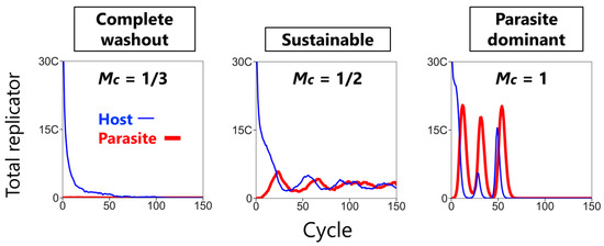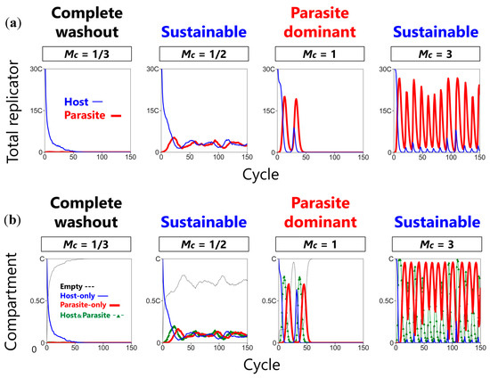 When the mixing intensity was low (Mc = 1/3), the hosts went extinct because the propagation of the hosts into empty compartments could not keep up with the washout rate (Figure 5a, Mc = 1/3). As we increased the mixing intensity (Mc = 1/2), the CHPR system became sustainable because the hosts were able to propagate into a sufficient number of compartments to keep up with the washout rate, and the parasites replicated in relatively smaller amounts. Under this condition, all types of compartments coexisted with the empty compartment as the major fraction (Figure 5b, Mc = 1/2). Further increase in the mixing intensity (Mc = 1) resulted in the extinction of the hosts again after approximately 60 cycles (Figure 5a, Mc = 1). We noticed that, just before extinction (around cycle 50), the host-only compartments disappeared, and subsequently the host–parasite compartments disappeared (Figure 5b, Mc = 1). A much further increase in the mixing intensity (Mc = 3), however, made the CHPR system sustainable again (Figure 5a, Mc = 3). Under this condition, the replicators continued to survive for more than 150 cycles (Figure 5b, Mc = 3).