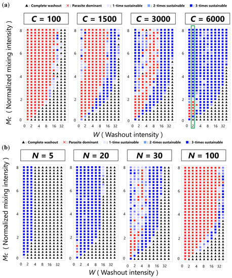 Figure 4a shows phase diagrams with various population sizes of compartments. When the population size of compartments is small (C = 100), most of the phase plane was covered by extinct regions, i.e., complete washout (black triangles) and parasite dominant regions (red crosses). A complete washout region appeared at low mixing and high washout intensities, and a parasite dominant region appeared at high mixing and low washout intensities. A narrow sustainable region (blue squares) was barely observed between the complete washout region and the parasite dominant region. As we increased the population size of compartments (C = 1500 and 3000), the sustainable region expanded, and another sustainable region appeared in the region of high mixing and low washout intensities. As the population size of compartments further increased (C = 6000), the two sustainable regions coalesced.