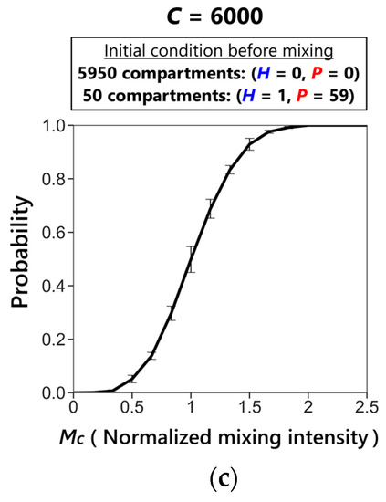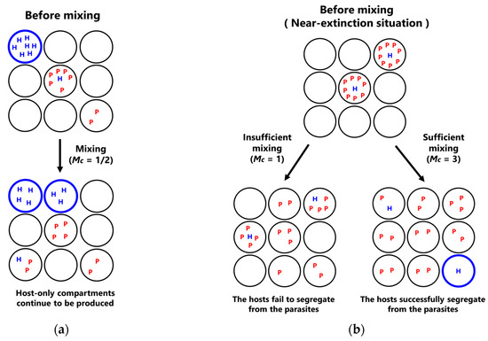 This transition of sustainability according to the change of the mixing intensity is explained as follows. The sustainability of the CHPR system solely depends on the existence of host-only compartments because the hosts can only proliferate in host-only compartments, as shown in Figure 2 (left). In the sustainable phase at a modest mixing intensity (Mc = 1/2 in Figure 5), the host-only compartments remained because the propagation of the hosts from host-only compartments to empty compartments continued to occur, while the parasite propagation rate was low enough, such that the parasites did not invade all the host-containing compartments. In contrast, a different mechanism underlies the sustainable phase at a high mixing intensity (Mc = 3 in Figure 5). The key event occurred at the lowest part of the oscillation dynamics, where all of the hosts are encircled with many parasites as schematically shown in Figure 6a. In this situation, the only way for host revival is that the hosts are segregated from the surrounding parasites and propagate into empty compartments through many fusion-fission events between host–parasite compartments and empty compartments. Therefore, the high mixing intensity, which means a large number of fusion–fission events, allows the increase in the probability of host segregation. In summary, the sustainability at the lower mixing intensity (Mc = 1/2) is achieved by the existence of host-only compartments that propagate without parasite invasion, while the sustainability at the higher mixing intensity (Mc = 3) is achieved by the transient escape of hosts from the compartments where parasites coexist.