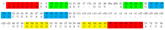 Each vertical position in the alignment is interpreted as a random variable with values ranging over all possible nucleotide states at this position in the tRNAs in the alignment. In other words, each vertical position is a discrete random variable with a number (label) assigned. These labels, or variable names, are thus invariant for all tRNA molecules. To avoid confusion with position numbering, Figure 1 depicts the layout of consensus tRNA sequence. The first row corresponds to the numbering scheme adopted throughout most of this study; position numbers in the first row are also the variable (node) names in the BNs. This is a universally accepted tRNA numbering standard ([17]). The master, or majority consensus, tRNA sequence (second row in Figure 1) contains notable fragments of tRNA molecule colored in red (acceptor stem), green (D-arm), blue (anticodon 131 arm) and yellow (T-arm). The same color scheme is used in the resulting BNs. Therefore, by consulting Figure 1 when evaluating these study results, it is easy to visually link to the specific positions and sections of the tRNA molecule.
