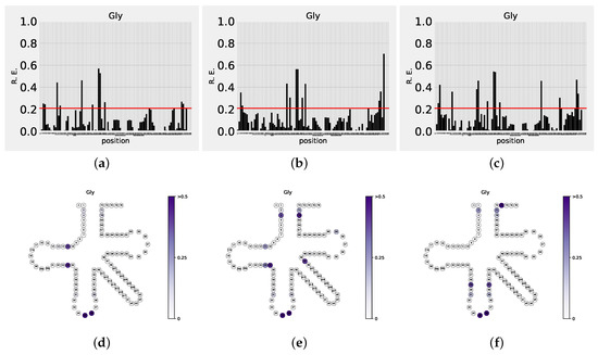 Position “importance” profile for Gly tRNAs, shown for three life domains: Archaea (a,d), Bacteria (b,e) and Eukarya (c,f). Relative Entropy is shown as function of tRNA position (a–c) (enumerated as in Figure 1, first row), or visualized as color intensity superimposed over the secondary tRNA structure (d–f). Significance cutoff limit is shown as a red line in (a–c)—see text for discussion.