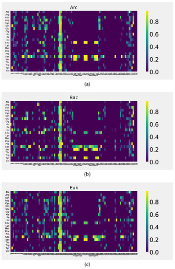 Summary visualization of the tRNA position “importance”, for all aa tRNA subclasses, shown for three life domains: Archaea (a); Bacteria (b) and Eukarya (c). Higher values correspond to “hotter” colors. tRNA position numbering is as in Figure 3. This is a summary visualization of the detailed plots presented in Supplemental Figures S1–S22.