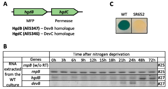 Expression of the hgdB gene and growth of the mutant strain SR652. (A) Scheme showing the hgdBC (all5347/6) gene cluster. MFP—membrane fusion protein; (B) Time-dependent expression analysis of hgdB in comparison to devB in the wild-type (WT) culture during nitrogen starvation performed by RT-PCR. rnpB (ribonuclease B) was used as a loading control ensuring the equal amount of RNA used for cDNA synthesis in each sample. Numbers at the right side of the table are numbers of PCR cycles. (C) growth of spotted colonies from a nitrogen stepdown experiment of liquid cultures of the WT and SR652 strain on BG110 agar plates, starting at 0.25 μg of chlorophyll a and incubated for 10 days.