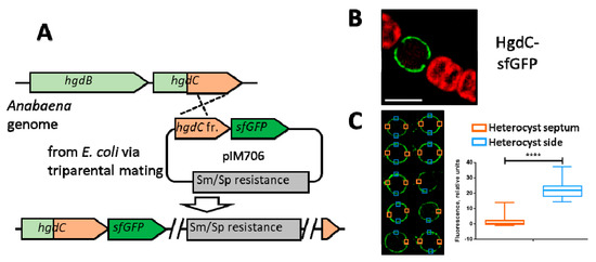 For localization studies, a plasmid with a gene coding for a translational fusion of the HgdC C-terminal end with the super-folder GFP (sfGFP) [31] was constructed. Sequences of the 3′ end of hgdC and the entire sfGFP were amplified by PCR and cloned into the XhoI restricted suicide vector pRL277 using Gibson assembly. This resulting plasmid pIM706 (see Figure 2A) was transferred into wild-type Anabaena cells using triparental mating, followed by plating on streptomycin- and spectinomycin-containing BG11 agar plates. Growing Anabaena colonies contained the hgdC gene fused with the sfGFP. The fusion was confirmed by colony PCR, and the strain was called SR706.