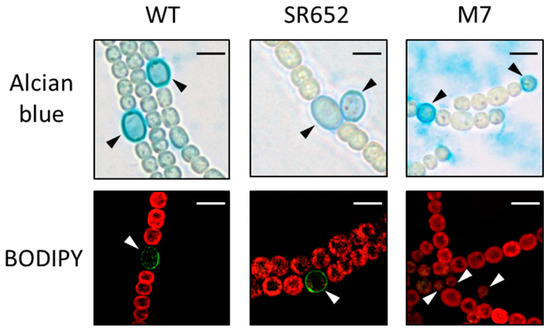 Micrographs of the SR652 filaments in comparison to the WT and DevA-deficient mutant M7. Alcian blue stains exo-polysaccharides in blue; the green fluorescent dye BODIPY binds to neutral lipids. The red color indicates the cyanobacterial autofluorescence coming from the photosynthetic pigments. Heterocysts are indicated by triangles. Both staining procedures were performed after three days of nitrogen starvation. Bars, 5 μm.