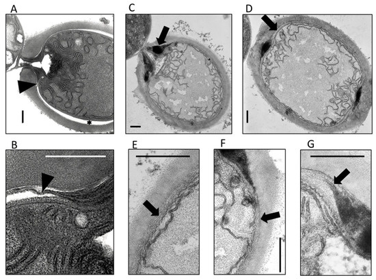 To investigate the non-functional heterocysts in more detail, the ultrastructure of ultrathin sections was analyzed. The vegetative cells did not present any differences between the wild type and the SR652 mutant (not shown), and the heterocysts of SR652 displayed the outer hep layer like the wild-type heterocysts (Figure 4). However, differences were obvious in the laminated layer. Compared to the wild type, it was much thicker around the so-called polar neck at each end of the heterocyst (see also figures in [18,20] and Figure 4C,G). A less-structured layer was evident below the hep layer, which resemble neither the hgl nor the hep layer (Figure 4C–G). In contrast to the wild type, where a thin electron dense layer went all around the heterocyst between the cell wall and the hep layer, the transition of the massive hgl deposition from the neck area to the heterocyst circuit was not evident in the mutant heterocyst. Instead, the laminated layer transformed to this abnormal extra layer, which then encompassed the entire heterocyst. In some sites, the extra layer appeared between two darker stained laminated layers, similar to previous observations (see Figure 4G and Figure 2 in [22]).