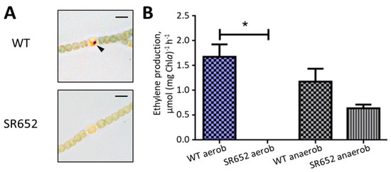In the case of aberrant envelope formation, heterocysts are not able to produce a micro-oxic environment suitable for nitrogenase. To check the micro-oxic situation in the heterocysts of strain SR652, the filaments were incubated with TTC, which forms dark-red or brown precipitates under low oxygen (hence in heterocysts of the wild type) [35]. No such precipitates were detected in the mutant heterocysts (Figure 5A). To investigate whether the mutant was unable to fix nitrogen, the nitrogenase activity was measured by the acetylene reduction assay [40]. Only under anoxic conditions the nitrogenase activity of the mutant was detectable, although it was lower than in the wild type. There was no activity under normal aerobic conditions (Figure 5B). This is a clear indication that heterocysts of the mutant cannot provide the micro-oxic environment for the nitrogenase, which can be active only under anoxic conditions in the mutant. This phenotype is typical for mutants defective in the heterocyst envelope [45].