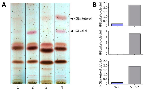 Analysis of heterocyst-specific glycolipids from whole cell extracts of the mutant SR652 and the WT. (A) Thin-layer chromatography of lipid extracts from liquid cultures before and 3 days after nitrogen stepdown; 1—wild type with nitrate, 2—wild type without nitrate, 3—SR652 with nitrate, 4—SR652 without nitrate. Black triangles indicate two major forms of heterocyst-specific glycolipids (HGLs). Shown is a representative thin layer chromatogram of five independent experiments; (B) Ratios of different keto-variants of HGLs to their corresponding hydroxy forms.
