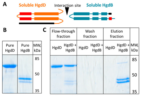 Pull-down assay showing an interaction between purified soluble HgdD (TolC) and HgdB (All5347). (A) Scheme of the soluble proteins of HgdB and HgdD used for the assay. Tags (GST for HgdD and Strep for HgdB) are shown in black, membrane domains substituted by glycine-serine linkers are depicted in red; (B) SDS-PAGE of the purified HgdD and HgdB fragments; (C) SDS-PAGE of pull-down fractions. MW—molecular weight.