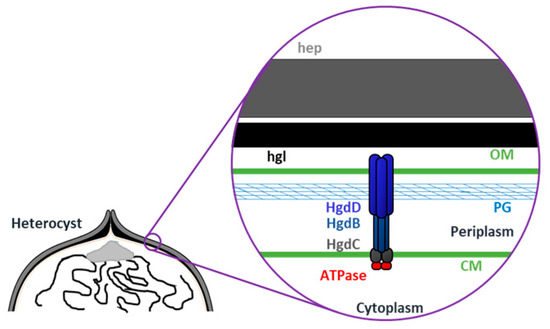Model of the putative TolC-HgdBC in the cell wall of heterocysts. The TolC-HgdBC is present in the whole perimeter of the heterocyst except the polar neck and perhaps exports HGLs, a specific protein, or another factor, crucial for correct hgl layer formation. Hep—polysaccharide layer, hgl—glycolipid layer, OM—outer membrane, PG—peptidoglycan, CM—cytoplasmic membrane.