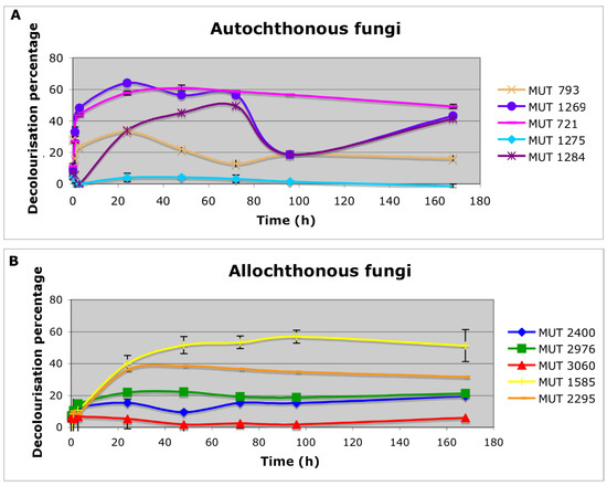 Allochthonous biomasses determined a slower decolorization, achieving a pick within 1–4 days. P. spadicea MUT 1585 achieved the highest color removal (51% within seven days). P. ostreatus MUT 2976 and T. pubescens MUT 2400 showed comparable decolorization yields (DP around 20%). The two strains belonging to the species B. adusta, MUT 3060 and MUT 2295 showed significantly different decolorization capacity (4% and 40%, respectively). The great diversity in decolorization yields indicates that the degradation capabilities are strain-specific rather than species-specific. The different behavior of these two strains was already observed towards textile wastewater [33].