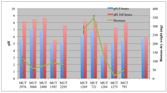 Biomass developed at the end of the experiment, and pH at the beginning (0 h) and at the end (168 h) of the experiment.