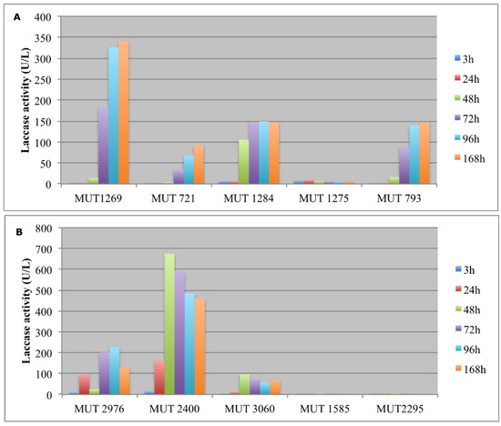 As regards the allochthonous strains, T. pubescens MUT 2400 showed a typical inductive mechanism, producing a huge amount of laccases after 24–48 h. It is well known from the literature, indeed, that the production of some kinds of oxidative enzymes by basidiomycota is due to a secondary metabolism activated by the presence of aromatic compounds [40].