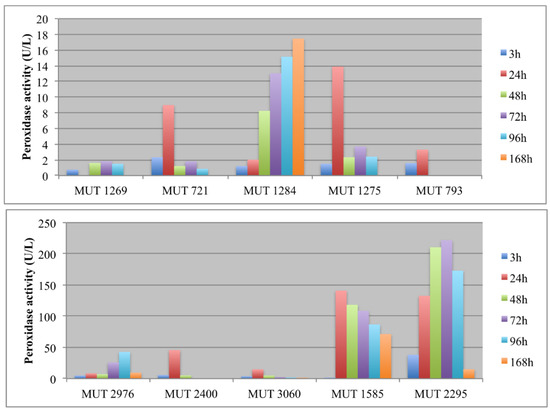 A high peroxidase activity was produced only by P. spadicea MUT 1585 and B. adusta MUT 2295. As regards this latter strain, the peroxidase activity was very variable, showing a severe decrease of enzyme production at the end of the experiment (Figure 4a). Peroxidases are oxidative enzymes with an optimum of activity in acidic environments (around pH 4.5–5.5) and could be induced by phenolics in wastewater [41]. Thus, the high production of peroxidases by P. spadicea MUT 1585, coupled to the strain capacity of maintaining the wastewater pH near a neutral value, is noteworthy. Peroxidases from white rot fungi, contrarily to laccase, demonstrated to be stable in the treatment of high phenolic content wastewater such as olive mill wastewater [41].