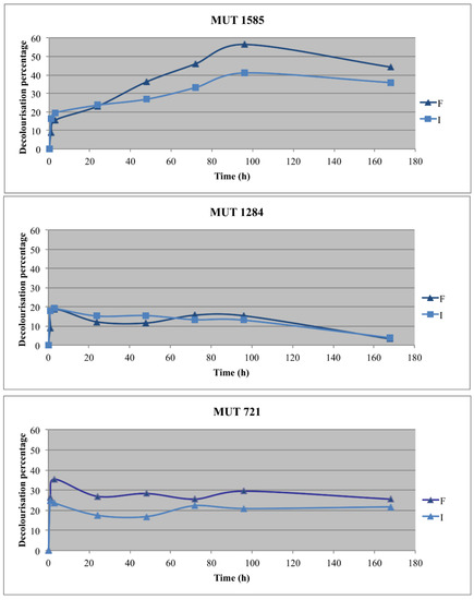 Two autochthonous fungi, P. sanguinea MUT 1284 and P. boydii MUT 721, and one allochthonous fungus, P. spadiceum MUT 1585, were selected for the optimization experiments with the fungal biomass immobilization. The effluent decolorization was recorded in all the experimental lines (Figure 5).