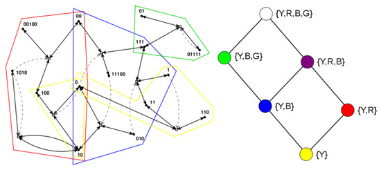 Figure 1 (right) with their respective colours, the combination of RAF subsets they are made up of, and where an edge between two nodes means that the closed RAF at the lower end of the edge is a direct subset of the closed RAF at the upper end of the edge.