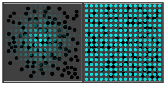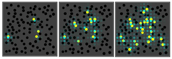Figure 3 shows the basic simulation setup at two different time steps. The spatial environment consists of a 16 × 16 grid, with 100 randomly distributed compartments (black spheres). Blue spheres indicate the (relative) concentration of food molecules in each of the grid locations. Faint (transparent) spheres indicate low concentration, and bright (solid) spheres indicate high concentration (relative to the grid location with the highest current concentration). Early on during the simulation (left frame), the food molecules are just starting to diffuse throughout the grid, while being introduced into the environment at a constant rate in the center of the grid. Later on during the simulation (right frame), an equilibrium distribution of food molecules as been reached. Food molecules will also have entered the compartments, but there is no actual chemistry going on yet (i.e., all reaction rate constants have been set to zero).