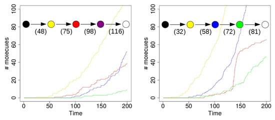 Figure 1 (left), i.e., an autocatalytic set that occurs in an instance of the binary polymer model. For simplicity, the simulations only consider ligation reactions. For each such reaction, an uncatalysed and a catalysed instance is included, but with different rate constants such that the rate constant for the uncatalysed reaction instance is lower than that of the catalysed reaction instance. The actual chemical dynamics within each compartment is simulated using Gillespie’s stochastic simulation algorithm [