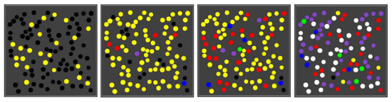 Note that the compartment indicated by the white circle changes from blue to purple to red. In the previous simulation, this would not have been possible, since concentrations of long polymers cannot decrease. However, what happened in this simulation is that the given compartment acquired the blue RAF subset first (becoming blue) and then the red one (becoming purple), but then the toxic element produced by the red subset destroyed the blue subset, causing the compartment to change to red. On the other hand, the red subset can also (temporarily) destroy itself. If all the molecules of type 00100 produced by the red subset turn into toxic elements, the red subset itself does not exist anymore either, until new 00100 molecules are produced. Thus, a compartment could also oscillate between yellow and red. Both of these situations happen in various locations and at various times in the simulation, a movie of which (for 100 time units) is available on the mentioned web page.