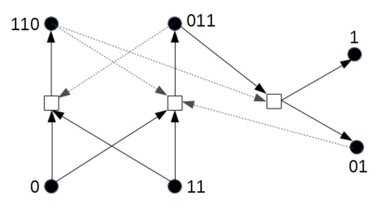 Suppose that molecule type 00100, produced by the red RAF subset, can spontaneously turn into a “toxic” element that catalyses the destruction of molecule type 11100, which is produced by and acts as a catalyst of the blue RAF subset. In other words, once the red RAF subset is present, it can suppress the existence of the blue RAF subset. This way, it is possible to have “mutations” where an autocatalytic subset is lost. Such an event is illustrated in