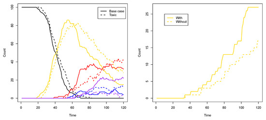 Another way to see the influence of the toxic element, compared to the base case from the previous subsection, is to look at the number of compartments of each type (i.e., colour) over time. Figure 9 (left) shows such a comparison for two representative simulations for each case. As this plot shows, in the toxic element case (dashed lines), the number of purple compartments is clearly suppressed, as it is now more difficult to have the red and blue RAF subsets existing simultaneously.