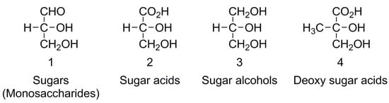 The most recent works on the search for meteoritic polyols reported the finding of one sugar (dihydroxyacetone), several sugar alcohols, sugar mono- and di-acids and deoxy sugar acids [,] (Figure 3).