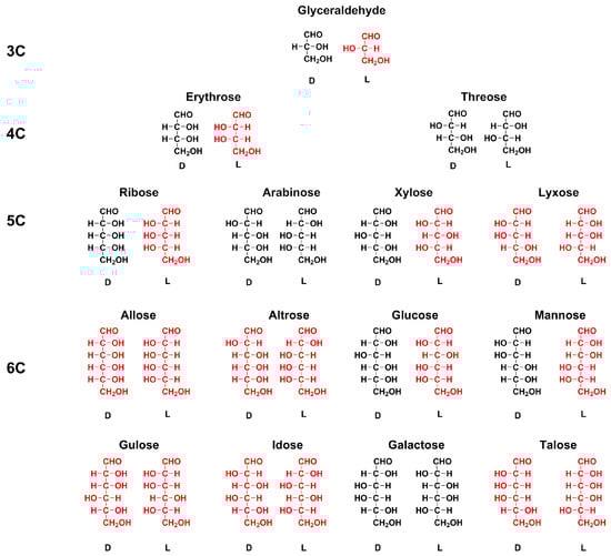 3C–6C Straight-chain sugar (aldose) enantiomers. The biologically more abundant enantiomers are shown in black, and the relatively rare enantiomers are in red. In some cases, the less common enantiomer of a pair is still found in biology, e.g., both enantiomers of arabinose are shown in black. However, the l enantiomer is much more common. The d enantiomers of threose and galactose are more common than the l.