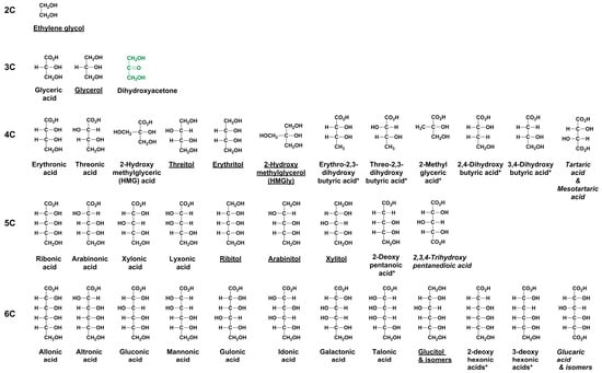 Structures and names of all known polyols identified in carbonaceous meteorites [,]. Deoxy sugar acids are marked with (*), sugar alcohols are underlined, and dicarboxy sugar acids are italicized. The only sugar (by definition) is the 3C compound dihydroxyacetone, a ketose that exists in equilibrium with its aldose isomer, glyceraldehyde.