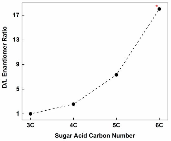 The d/l enantiomeric ratios of meteoritic aldonic acids (Figure 3) increase with carbon number []. The asterisk shown in the 6C value is extrapolated based on the d/l trend of 3C → 4C sugar acids as reported in [].