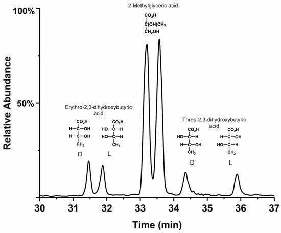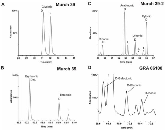 Chromatograms of aldonic acid enantiomer analyses of carbonaceous meteorites []. (A) 3C (glyceric acid) enantiomers from the Murchison (Murch) meteorite. (B) 4C enantiomers. (C) 5C enantiomers. (D) 6C enantiomers, GRA 06100. No 6C l enantiomers were found. The enantiomers depicted as glyceric acid in (A) [] may actually be from a chiral alkaline or polymer reaction product of glyceric acid (as shown by glyceric acid standards in carbonate solutions). However, other runs of GRA 95229 show that both glyceric acid and possible reaction products are racemic.