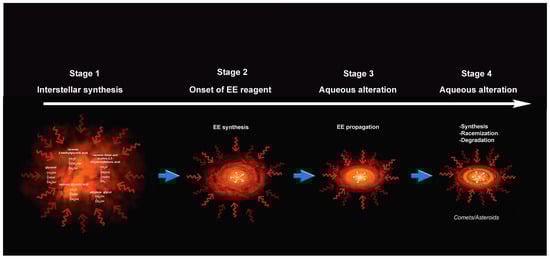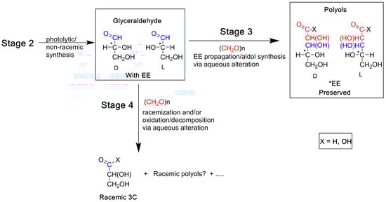Scenario Stage 2—The Onset of Chiral Influences and Enantiomeric Excess. At the formation of the early pre-solar disk, an asymmetric reagent(s) became available for the creation of ee in subsequently produced chiral compounds. For example, the ee resulting from increased magnetic field strength combined with ambient irradiation, CPL, or CPL from the light scattering of grains and/or dichroic extinction (Section 5). The collapse and concentrating of material (including ions and magnetic fields) from the molecular cloud to a relatively ordered disk would seem to serve the purpose of the above mechanisms. If density of material were a significant factor, then one would expect increased ee production with decreasing distance to the center of the disk. Although a smaller number of polyols are produced at stage 2, lower mass polyols, including dihydroxyacetone/glyceraldehyde, are known low temperature photo-irradiation products. Once produced in this non-aqueous environment, low temperatures temporarily preserve chiral compounds and their ee. One possible mode of synthesis in the early solar disk, even at low temperatures, is the reaction between reactive ions and radicals (formed by earlier or concurrent irradiation) of close proximity in ices []. Despite the general reactivity of radicals, some (usually in aromatic structures) are indefinitely stable. Others, such as di-t-butyl methane radical, C(CH3)3-CH-C(CH3)3, are stable in dilute solution, at temperatures (−30 °C in this case) well above interstellar and in the absence of oxygen []. Many organic nitroxide radicals, (RR)N-O• are stable under normal conditions; C(CH3)3-N(O•)-C(CH3)3 is stable to oxygen even above 100 °C []. Excursions to higher disk temperatures would increase the molecular mobility of ions and radicals and therefore reaction rates []. We note that the melting point range of important precursor molecules such as formaldehyde, acetaldehyde and methanol (unionized at STP) is approximately 149–181 K.