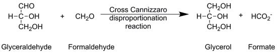 An attempt to understand, at least qualitatively, the relative significance of the two above-mentioned synthetic mechanisms (aqueous versus photolytic) and to discern the location(s) of synthesis of meteoritic polyols, might have implications for theories on the origin of (or lack of) their observed ee (Section 2.2 and Section 5). An example is glycerol and other sugar alcohols. As mentioned in Section 3.1, conditions in meteorite parent bodies were apparently not optimum for polyol production. Even in laboratory formose reactions, where Ca(OH)2 is used as an efficient catalyst for the production of sugars, one report states that “only a small proportion of alditols form” [] (alditols = sugar alcohols). In fact, even to produce glycerol in formose reactions, “higher temperatures” and “lower pH” were among the necessary conditions [], as this production is due to the resulting increased rate of the crossed-Cannizzaro reaction. In the formose reaction, the most straightforward way to obtain glycerol would be via the cross-Cannizzaro reaction of glyceraldehyde (Scheme 1):