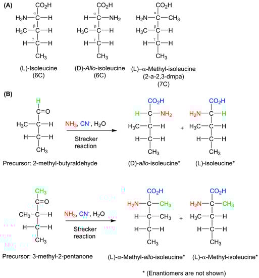 Can a comparison of the structural relationships and enantiomer properties of isoleucine and methylisoleucine shed light on the broader question of the original nature of ee in at least some meteoritic compounds? From its structure it can be seen that isoleucine has two chiral carbons and therefore so does its diastereomer, allo-isoleucine; in both compounds, the α carbon is bonded to H. The ee of isoleucine was found to be in the l enantiomer and the ee of allo-isoleucine in the d enantiomer []. This is understandable if viewed from the perspective of an unbiased aqueous synthesis from the precursor aldehyde, as some proportion of both isoleucine and allo-isoleucine will be produced (Scheme 2B). Epimerization (see legend of Scheme 2) will also lead to some equilibrium proportion of the two, as aqueous alteration facilitates the relatively easy exchange of α hydrogens (with water) and leads to inversion of configuration (at the α carbon), thus converting isoleucine into allo-isoleucine, and vice versa (Scheme 2). The next carbon in each compound (the “β carbon”) is much more difficult to racemize—due to its position in the chain—even though this carbon is also bonded to a hydrogen. In contrast to isoleucine, the 7-carbon homologs (α-methyl-isoleucine and α-methyl-allo-isoleucine) have methyl groups at both the α and β carbon, Scheme 2B. Therefore, once formed, these latter diastereomers will likely preserve a very significant fraction of their original chiral properties at both chiral carbons and, again from an aqueous point of view, should retain their d/l ratios longer than isoleucine and allo-isoleucine. Surprisingly, while isoleucine and allo-isoleucine had enrichment in their l and d enantiomer, respectively (see above), α-methyl-isoleucine and α-methyl-allo-isoleucine both contained l enantiomer excesses []. In fact, the authors of that study expected opposite enantiomer enrichments in these diastereomers due to the above arguments of aqueous synthesis (e.g., Scheme 2) (the ee of α-methyl-isoleucine and α-methyl-allo-isoleucine [] were discovered before those of isoleucine and allo-isoleucine []).