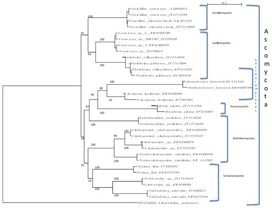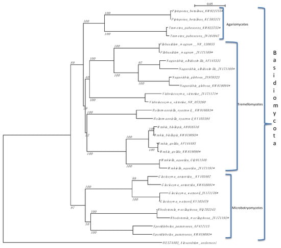 - White, T.J.; Bruns, T.; Lee, S.; Taylor, J. Amplification and direct sequencing of fungal ribosomal RNA genes for phylogenetics. In PCR Protocols: A Guide to Methods and Applications; Innis, M., Gelfand, J., Sninsky, J., White, T.J., Eds.; Academic Press: Orlando, FL, USA, 1990; pp. 315–322. [Google Scholar]